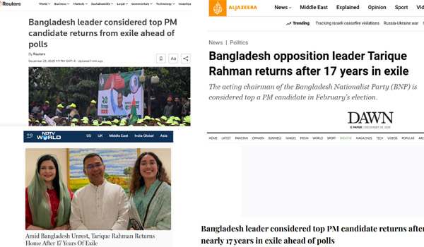 ব্রিটিশ সংবাদসংস্থা রয়টার্সের শিরোনামও একই ধরণের—‘নির্বাচনের আগে দেশে ফিরলেন বাংলাদেশের সম্ভাব্য প্রধানমন্ত্রী প্রার্থী’। এতে তারেক রহমানের দেশের প্রতি প্রত্যাবর্তনের গুরুত্ব জোরপূর্বক তুলে ধরা হয়।