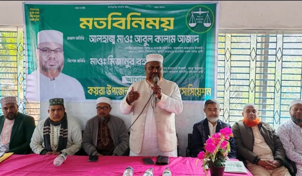 জামায়াতের কেন্দ্রীয় কর্ম পরিষদ সদস্য, খুলনা অঞ্চল সাধারণ সম্পাদক এবং খুলনা-৬ আসনের জাতীয় সংসদ সদস্য প্রার্থী মাওলানা আবুল কালাম আজাদ বলেন, দেশের মানুষের ন্যায্য অধিকার ফিরে পেতে এবং সমাজে নীতি ও আদর্শভিত্তিক নেতৃত্ব প্রতিষ্ঠার লক্ষ্যে জামায়াতে ইসলামি কাজ করছে। তিনি আরও বলেন, আমরা চাই একটি শান্তিপূর্ণ, সমৃদ্ধ এবং ইসলামী মূল্যবোধে ধ্রুবতুর সমাজ গঠন হোক। এলাকার সার্বিক উন্নয়ন, সুশাসন এবং ইসলাম ভিক্তিক সমাজ গঠনে জামায়াতের ভূমিকা তুলে ধরে তিনি বলেন, আসন্ন জাতীয় সংসদ নির্বাচনে ভোটাররা ন্যায্য অধিকার প্রতিষ্ঠার জন্য ও একটি ন্যায়ভিত্তিক সমাজ গঠনের জন্য এই নির্বাচনে অংশ নিচ্ছে। এই আসনে তারা দাঁড়িপাল্লার পক্ষেই রায় দেবেন। শনিবার সকালে কোরারার কয়রা বালিকা বিদ্যালয় মাঠে কয়রা পল্লী চিকিৎসক সমিতির সঙ্গে এক মতবিনিময় সভায় প্রধান অতিথির বক্তৃতায় তিনি এসব কথা বলেন। এই সভায় সভাপতিত্ব করেন কয়রা পল্লী চিকিৎসক সমিতির সভাপতি সোহরাব হোসেন এবং সঞ্চালনা করেন সাধারণ সম্পাদক এমদাদুল হক। বক্তৃতা দেন উপজেলা আমীর মাওলানা মিজানুর রহমান, নায়েবে আমীর মাওলানা রফিকুল ইসলাম, সেক্রেটারি মাওলানা শেখ সাইফুল্লাহ, সহকারী সেক্রেটারি মাওলানা সুজা উদ্দিন, সমিতির উপদেষ্টা লুৎফর রহমান, সুন্দরবন নার্সিং হোমের পরিচালক কামরুজ্জামান টুকু, সহকারী সেক্রেটারি কামরাজ্জামান ও আমিনুর রহমানসহ অন্যান্যরা।