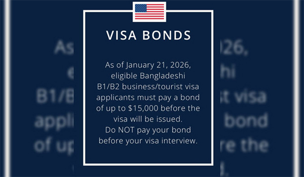 আগামী ২১ জানুয়ারি থেকে বাংলাদেশের নাগরিকরা যদি ব্যবসা বা পর্যটনের উদ্দেশ্যে মার্কিন যুক্তরাষ্ট্রের বি১/বি২ ভিসা পান, তাহলে তাদের ওপর নতুন এক শর্ত আরোপ করা হয়েছে। এখন থেকে, এই ভিসার জন্য অনুমোদিত হলে সর্বোচ্চ ১৫ হাজার মার্কিন ডলার পর্যন্ত ভিসা বন্ড জমা দিতে হবে। মার্কিন দূতাবাসের এক বিজ্ঞপ্তিতে এ তথ্য জানানো হয়েছে।