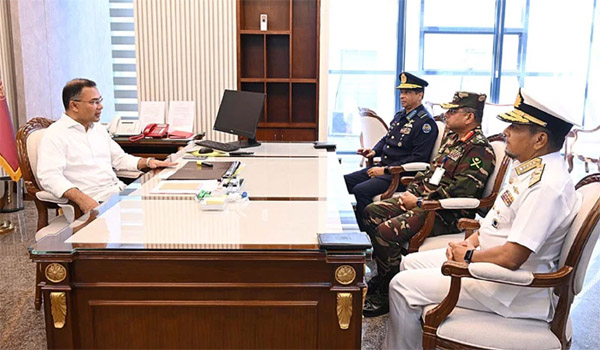 প্রধানমন্ত্রী তারেক রহমান সচিবালয়ে তার দপ্তরে দ্বিতীয় দিনের মতো দাপ্তরিক কার্যক্রম অব্যাহত রেখেছেন। আজ বৃহস্পতিবার সকালে তিনি তারকার সঙ্গে সৌজন্য সাক্ষাৎ করেন সেনাবাহিনী প্রধান জেনারেল ওয়াকার-উজ-জামান, নৌবাহিনী প্রধান অ্যাডমিরাল মোহাম্মদ নাজমুল হাসান এবং বিমানবাহিনী প্রধান এয়ার চিফ মার্শাল হাসান মাহমুদ খান। এই সাক্ষাতের সময় উপস্থিত ছিলেন প্রধানমন্ত্রী তারেক রহমানের উপদেষ্টা ব্রিগেডিয়ার জেনারেল (অব.) শামছুল ইসলাম।