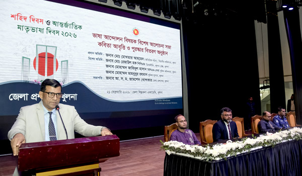 সকাল ১১টায় খুলনা জেলা শিল্পকলা একাডেমির অডিটোরিয়ামে আলোচনা সভা ও সাংস্কৃতিক প্রতিযোগিতার পুরস্কার বিতরণ অনুষ্ঠানে প্রধান অতিথির বক্তৃতায় বিভাগীয় কমিশনার মো: মোখতার আহমেদ বলেন, ভাষা আন্দোলনের মধ্যেই নিহিত ছিল স্বাধীনতার সূতো। মাতৃভাষা আমাদের আত্মার সঙ্গে গভীরভাবে জড়িয়ে রয়েছে। তিনি উল্লেখ করেন, বিদেশি ভাষা শেখার পাশাপাশি মাতৃভাষার প্রতি সজাগ থাকতে হবে, কারণ বাঙালির অস্তিত্ব ও চেতনায় এই ভাষার গুরুত্ব অপরিসীম।