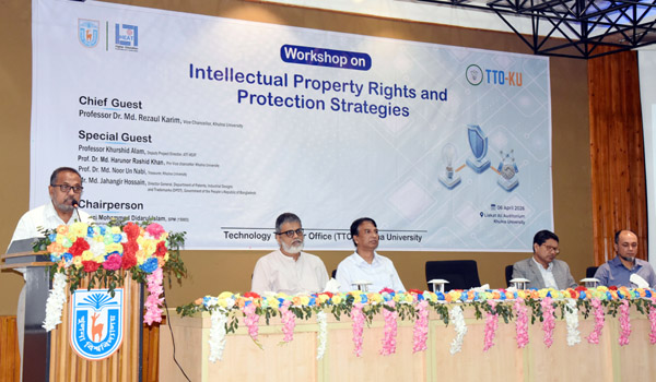 খুলনা বিশ্ববিদ্যালয়ের টেকনোলজি ট্রান্সফার অফিস (টিটিও) হিট সাব-প্রজেক্টের আওতায় ‘ইন্টেলেকচুয়াল প্রোপার্টি রাইটস অ্যান্ড প্রটেকশন স্ট্র্যাটেজিস’ শীর্ষক কর্মশালার আয়োজন করা হয়েছে। সোমবার (০৬ এপ্রিল) লিয়াকত আলী মিলনায়তনে অনুষ্ঠিত উদ্বোধনী অনুষ্ঠানে প্রধান অতিথির বক্তব্য রাখেন বিশ্ববিদ্যালয়ের উপাচার্য প্রফেসর ড. মোঃ রেজাউল করিম।