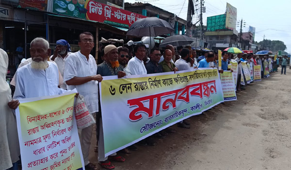 বৃহস্পতিবার সকালে ঝিনাইদহের কালীগঞ্জ উপজেলা শহরের মেইন বাসস্ট্যান্ডে এক মানববন্ধন ও সড়ক অবরোধের মাধ্যমে ক্ষতিগ্রস্ত জমির মালিক ও ব্যবসায়ীরা তাদের ন্যায্য মূল্য দাবি করেন। এই কর্মসূচি ঝিনাইদহ-যশোর মহাসড়কের ৬ লেনে উন্নীতকরণের সময় ক্ষতিগ্রস্ত ব্যক্তিদের সমস্যাগুলো তুলে ধরতেই আয়োজন করা হয়। এতে বিভিন্ন শ্রেণি-পেশার মানুষ, ব্যবসায়ী ও স্থানীয়রা ব্যানার এবং ফেস্টুন নিয়ে অংশ গ্রহন করেন। বক্তারা অভিযোগ করেন, ২০২২ সালে মৌজা মূল্য নির্ধারণে ক্ষতিগ্রস্ত জমির মালিকদের সাথে আলোচনা হয়নি। বর্তমানে যে দাম ধার্য করা হচ্ছে, তার সাথে জমির প্রকৃত মূল্য মারাত্মকভাবে অসংলগ্ন। যেমন, কোনও জমির মূল্য প্রতি শতাংশের জন্য ধার্য করা হয়েছে ১০ লাখ টাকা, অথচ দিতে হচ্ছে মাত্র ২ লাখ টাকা। এছাড়া, ক্ষতিগ্রস্ত বাড়ি বা প্রতিষ্ঠানের ক্ষতিপূরণও শুধু আংশিক দেওয়া হচ্ছে বলে অভিযোগ করেন তারা। ফলে জমির মালিক ও ব্যবসায়ীরা তাদের ন্যায্য পাওনা না পাওয়ার জন্য অসন্তোষ প্রকাশ করেন। এরপর তারা ঝিনাইদহ-যশোর মহাসড়ক অবরোধ করেন, যার কারণে ঝিনাইদহ থেকে যশোর, কুষ্টিয়া ও চুয়াডাঙ্গাগামী সকল যানবাহন বন্ধ হয়ে যায়। প্রায় এক ঘণ্টা পর, উপজেলা নির্বাহী কর্মকর্তার আশ্বাসে আন্দোলনকারীরা সড়ক থেকে অবরোধ প্রত্যাহার করে নেন। তারা বৃহৎ কর্মসূচির ঘোষণা করে জোরালোভাবে দাবি জানান, যাতে ক্ষতিগ্রস্তদের ন্যায্য মূল্য নিশ্চিত করা হয়।