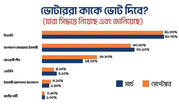 আগামী নির্বাচনে ৪১ দশমিক ৩০ শতাংশ নাগরিক বাংলাদেশ জাতীয়তাবাদী দল (বিএনপি)-কে ভোট দিতে আগ্রহী। একই সময়ে, দেশজুড়ে অতি পরিচিত জামায়াতে ইসলামীকে ভোটের জন্য পছন্দ করেছেন ৩০ দশমিক ৩০ শতাংশ মানুষ। এরপরই রয়েছে নিষিদ্ধ ঘোষিত আওয়ামী লীগ, যাদের প্রতি মানুষ এখন ১৮ দশমিক ৮০ শতাংশের বেশি সমর্থন দেখিয়েছেন। এই তথ্য উঠে এসেছে ইনোভিশন কনসালটিং নামে একটি বেসরকারি গবেষণা সংস্থার মাসিক জরিপ থেকে।