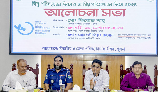 আজ সোমবার (২০ অক্টোবর) খুলনায় সবার জন্য মানসম্পন্ন পরিসংখ্যান প্রতিপাদ্য নিয়ে বিশ্ব পরিসংখ্যান দিবস এবং জাতীয় পরিসংখ্যান দিবস উদযাপন করা হয়। এ সময় বিভিন্ন অনুষ্ঠান এবং কার্যক্রমের মধ্যে অন্যতম ছিল সকালবেলা খুলনার বিভাগীয় কমিশনারের সম্মেলনকক্ষে অনুষ্ঠিত এক আলোচনা সভা। অনুষ্ঠানে প্রধান অতিথি হিসেবে উপস্থিত ছিলেন বিভাগের ভারপ্রাপ্ত কমিশনার মোঃ ফিরোজ শাহ।