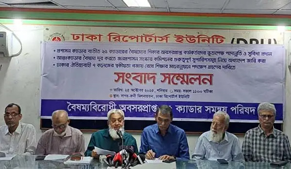 সংবাদ সম্মেলনে লিখিত বক্তব্য পাঠ করেন কৃষি সম্প্রসারণ অধিদপ্তরের সাবেক পরিচালক কৃষিবিদ আহমেদ আলী চৌধুরী ইকবাল। তিনি বলেন, আমরা গভীর উদ্বেগে লক্ষ্য করছি যে, সামাজিক মাধ্যমে দেশের জনপ্রশাসন নিয়ে মতামত প্রকাশের জন্য আন্তঃক্যাডার বৈষম্য নিরসন পর্ষদভুক্ত ২৫ ক্যাডারের ১৪ কর্মকর্তা খসড়া অভিযুক্ত ও আত্মপক্ষ সমর্থনের সুযোগ না দিয়ে চাকরিচ্যুত করা হয়েছে। অথচ একই সামাজিক মাধ্যমে অশালীন ও আপত্তিকর শব্দ ব্যবহার করে পোস্ট শেয়ার কিংবা লিখলেও প্রশাসনিক ব্যবস্থা গ্রহণ হয়নি। এই ধরনের পক্ষপাতদুষ্ট আচরণের বিরুদ্ধে কঠোর আপত্তি জানাচ্ছি।