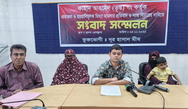 খুলনায় একটি মিথ্যা মামলায় জড়িয়ে ২৪ দিন কারাগারে বসবাস করতে হয়েছে নূর হাসান নামে এক ব্যক্তিকে। মঙ্গলবার সকালে খুলনা প্রেসক্লাবের মিলনায়তনে এক সংবাদ সম্মেলনে নিজের দুঃখ এবং পরিস্থিতি তুলে ধরেন তিনি। তিনি বলেন, আমার সঙ্গে একটি গার্মেন্টস পণ্য বিক্রির ব্যবসায় একজন ব্যক্তি ফাহাদ আহমেদ তৃপ্তের সঙ্গে কাজ করতাম। ব্যবসার সময় তিনি আমার থেকে দুই মাসের comissão হিসেবে প্রায় ৫ লাখ টাকা অগ্রিম নিয়েছিলেন, যা পরে সমন্বয় করার কথা ছিল। কিন্তু ঘটনার দিন, আমার অনুপস্থিতিতে তিনি ওই হিসাবের খাতা চুরি করে নিয়ে যান। আমি তখন ঢাকায় ছিলাম।