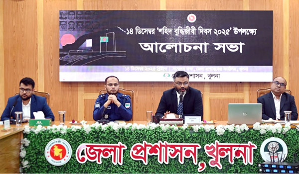খুলনায় শহিদ বুদ্ধিজীবী দিবস ২০২৫ উপলক্ষে আজ রোববার (১৪ ডিসেম্বর) এক আলোচনা সভা অনুষ্ঠিত হয়। এই কর্মসূচি জেলা প্রশাসকের সম্মেলনকক্ষে অনুষ্ঠিত হয়। সভায় সভাপতিত্ব করেন জেলা প্রশাসক আ. স. ম. জামশেদ খোন্দকার। অনুষ্ঠানের শুরুতে মহান মুক্তিযুদ্ধের শহিদ বুদ্ধিজীবীদের স্মরণে এক মিনিট নীরবতা পালনされ হয়।